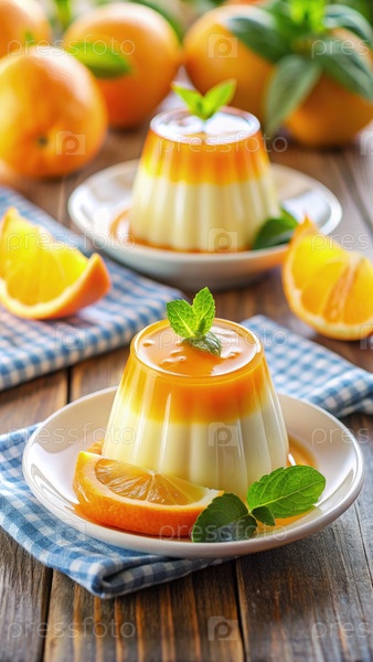 Оранжево-ароматизированный десерт Panna Cotta с мятой на деревянном столе