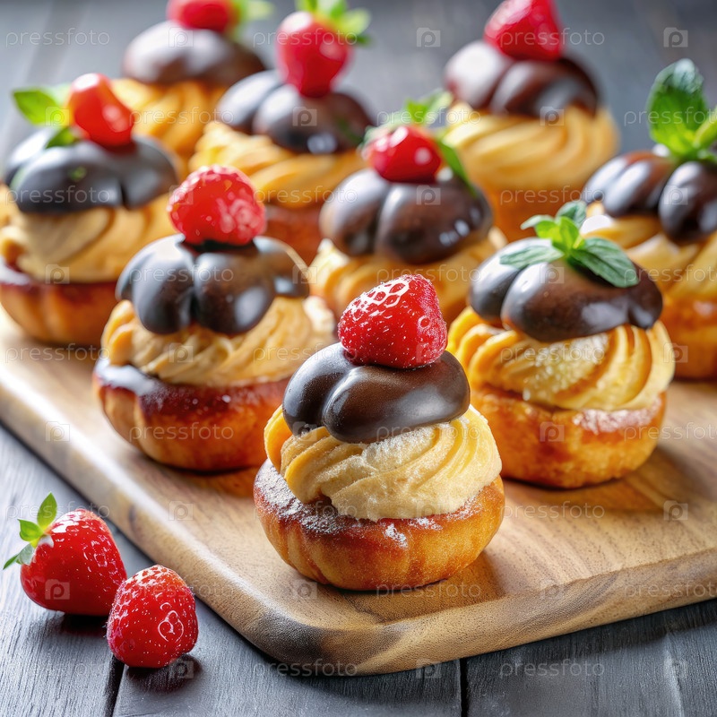 Вкусные шоколадно-покрытые сливочные бутылки со свежими клубниками на деревянной режущей доске