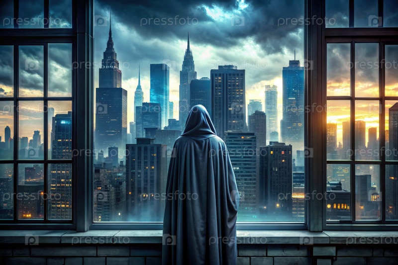 Одинокая фигура смотрит на темный городской пейзаж