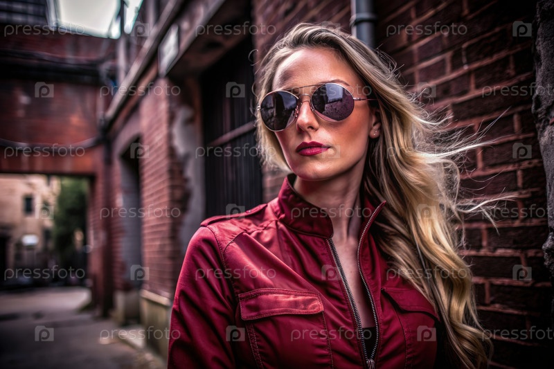 Женщина в красной куртке и солнцезащитных очках стоит на кирпичной аллее