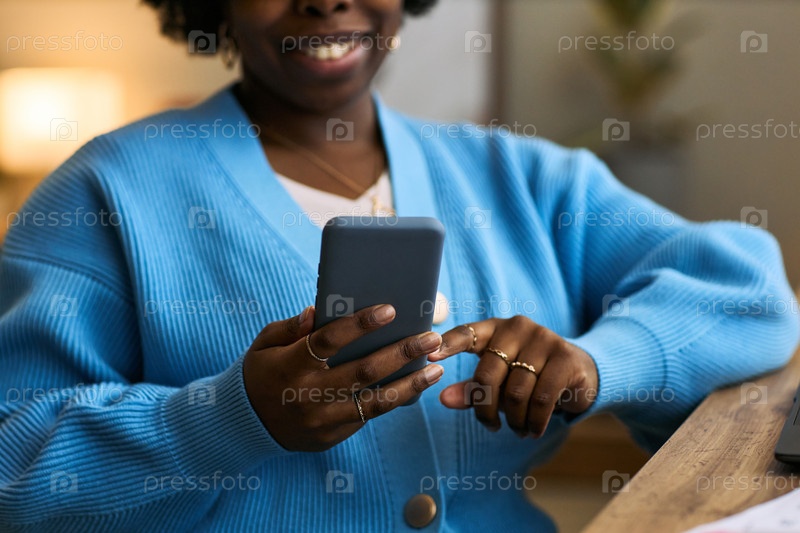 Молодая взрослая чернокожая женщина использует смартфон дома