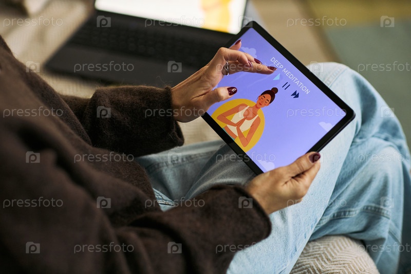 Белокожая зрелая женщина использует планшет для сеанса медитации с руководством
