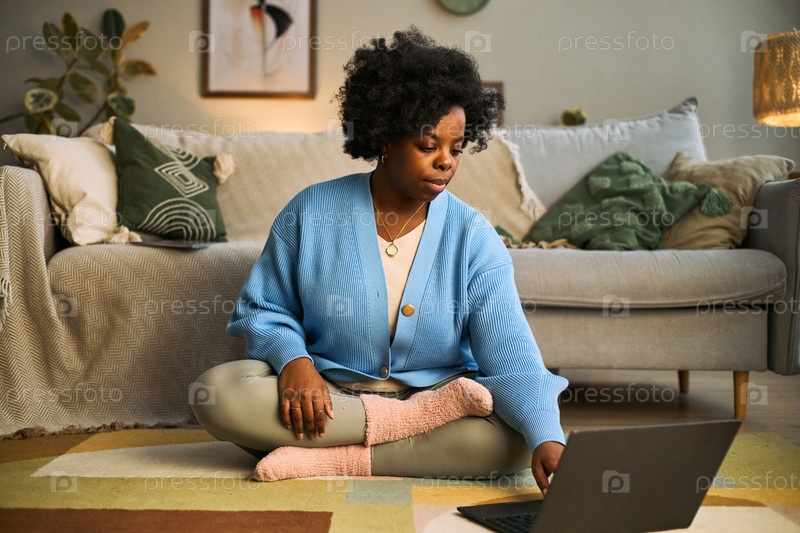 Молодая взрослая чернокожая женщина использует ноутбук для приложения Femtech Health в домашних условиях