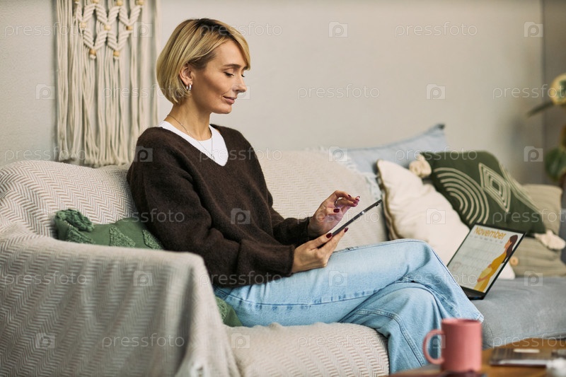 Кавказская женщина использует цифровой планшет для мониторинга здоровья Femtech
