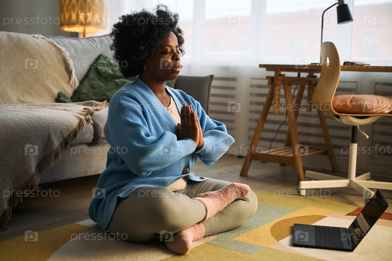Молодая взрослая чернокожая женщина практикует упражнения по управлению дыханием с помощью ноутбука в помещении