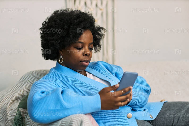 Молодая взрослая чернокожая женщина использует смартфон для Femtech Health Application Indoors