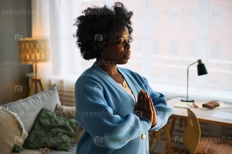 Молодая взрослая чернокожая женщина практикует упражнения по глубокому дыханию для оздоровления в помещении