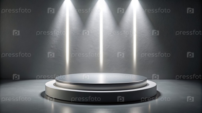 Серый круглый подиум, освещенный тремя светофорами в темной комнате