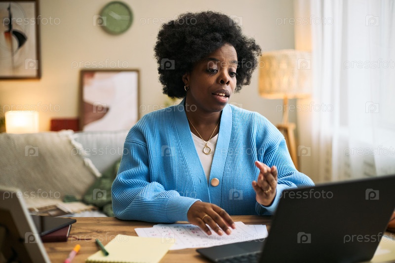 Молодая взрослая чернокожая женщина обсуждает Femtech Health Solutions во время видеозвонка