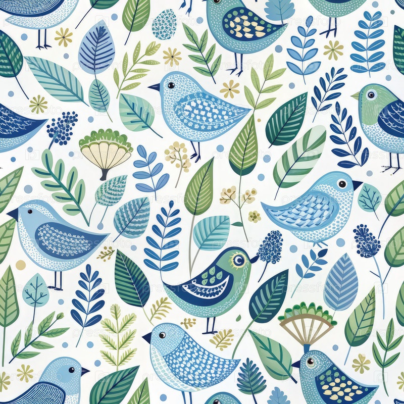 Бесшовный абстрактный скандинавский образ птиц со зелеными листьями и голубыми деталями
