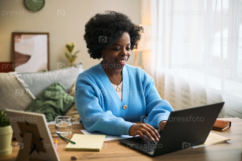 Молодая взрослая чернокожая женщина использует ноутбук для управления здоровьем Femtech дома