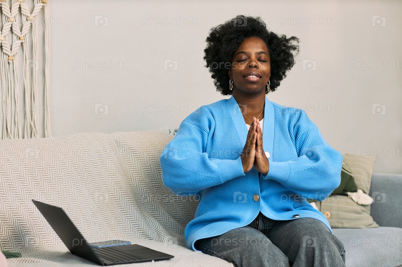 Молодая взрослая чернокожая женщина практикует медитацию осознанности с ноутбуком в помещении