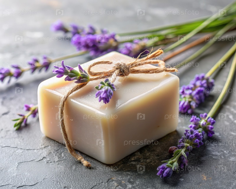 Однолистный лавандовый мыльный батончик, украшенный твином и свежими цветами лаванды. генератив AI
