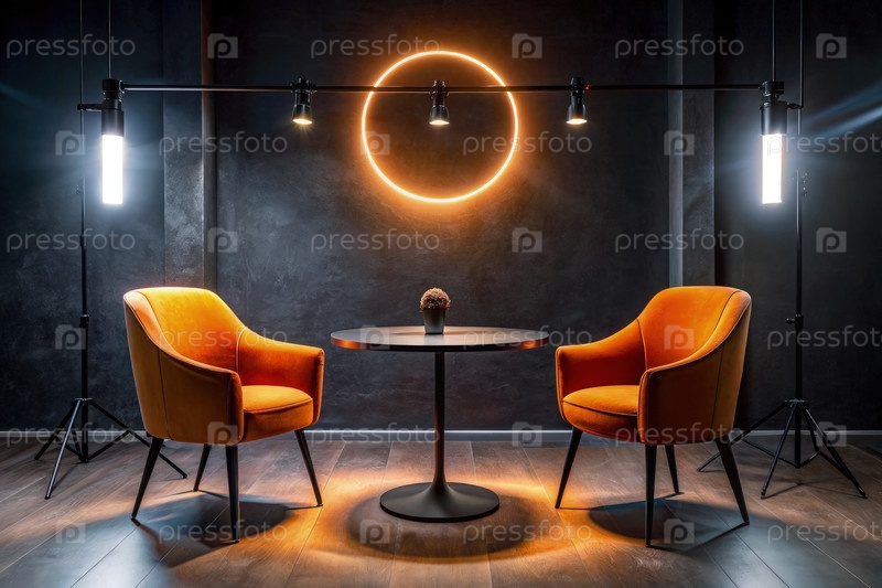 Минималистская интервью-студия с оранжевыми стульями и неоновым освещением
