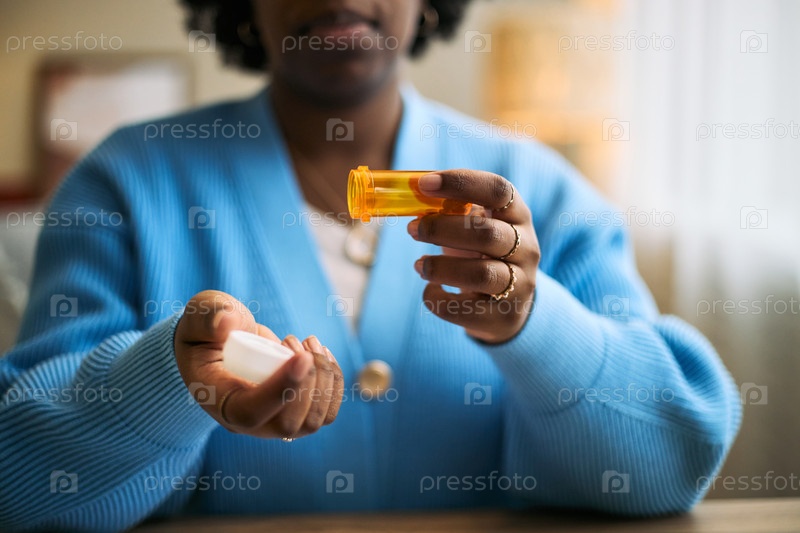 Чернокожая женщина среднего возраста держит бутылку с таблетками и раздает лекарства в помещении