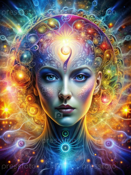 Цифровое произведение искусства, изображающее женщину с космической аурой и третьим глазом
