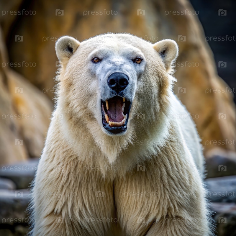 Испуганный белый медведь рычит перед камерой в зоопарке