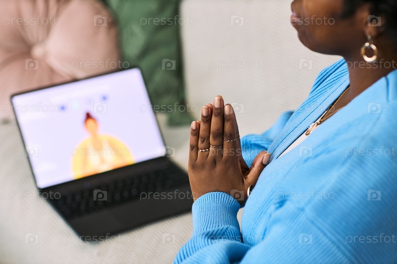 Молодая взрослая чернокожая женщина практикует медитацию осознанности с помощью ноутбука
