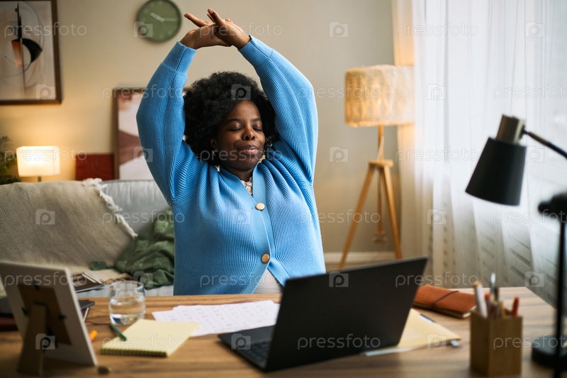 Черная женщина растягивает руки, работая удаленно в домашнем офисе