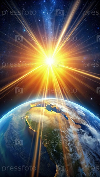 Иллюстрация солнечных лучей, сияющих на Земле из космоса