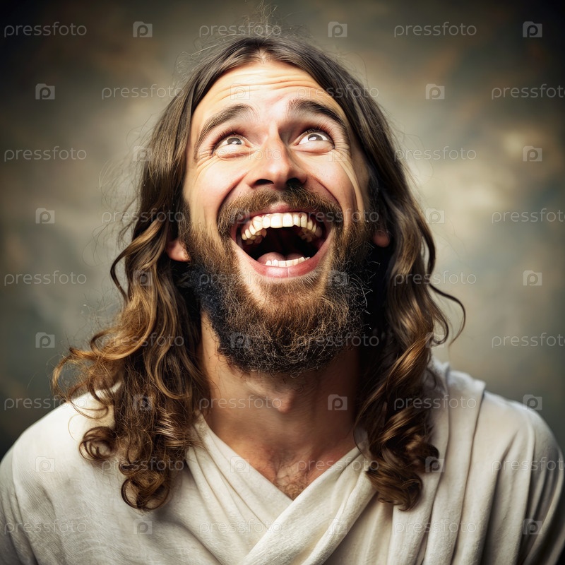 Человек, одетый как Иисус Христос, смеется вверх на студийном портрете
