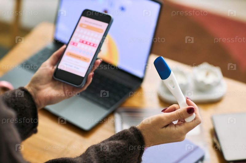 Кавказская женщина использует Femtech App во время проведения теста на беременность