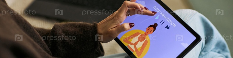 Кавказская женщина использует планшет для медитации с руководством в Femtech App