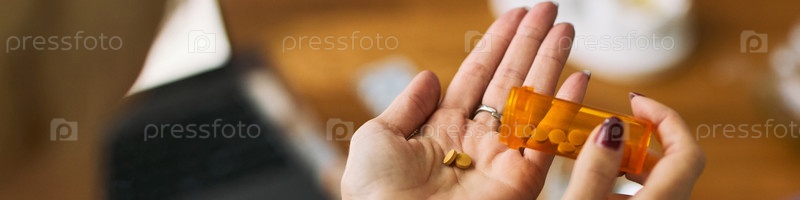 Белая женщина держит бутылку с таблетками и принимает лекарства в помещении