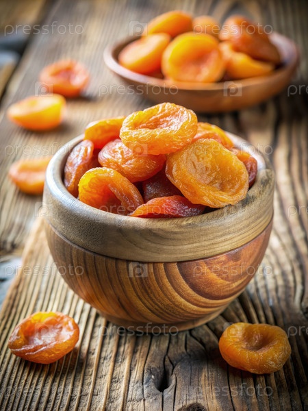 Сушеные абрикосы в деревянной миске на деревянном столовом столке