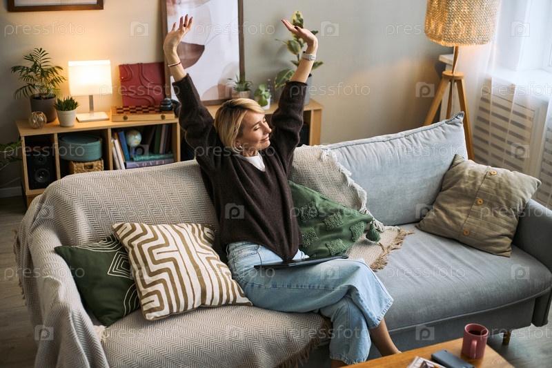 Белая женщина отдыхает на диване и растягивает руки дома