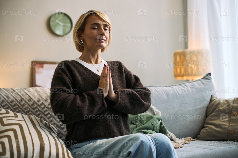 Кавказская женщина среднего возраста практикует медитацию осознанности в помещении