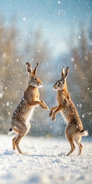 Два милых зайца, стоящих на снежном поле зимой