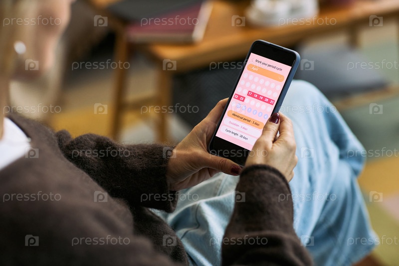 Кавказская женщина использует Femtech App для отслеживания менструального цикла