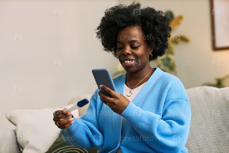 Молодая взрослая чернокожая женщина использует смартфон и держит медицинское устройство Femtech