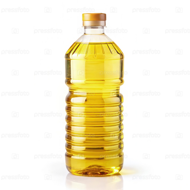 Прозрачная пластиковая бутылка кулинарного масла на белом фоне