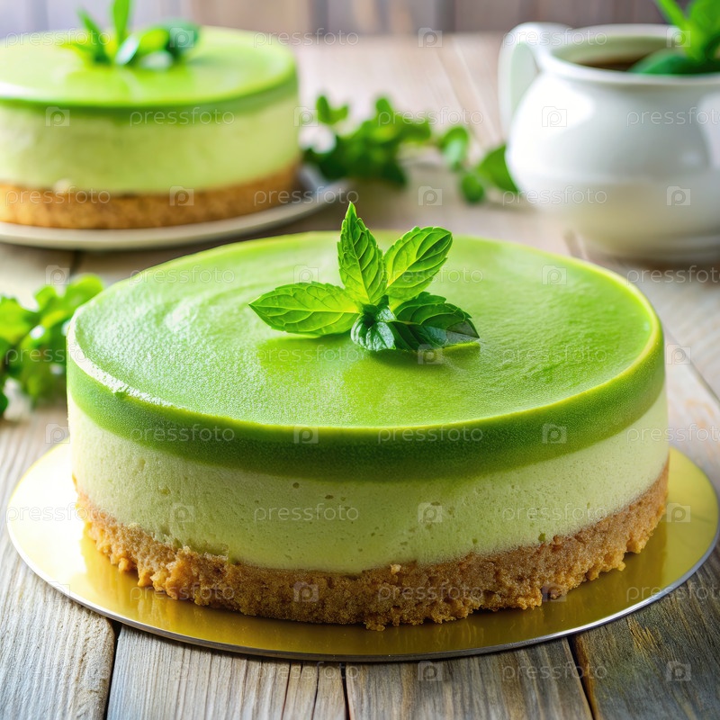 Зеленый сырный пирог со свежим мятовым украшением на деревянном столе