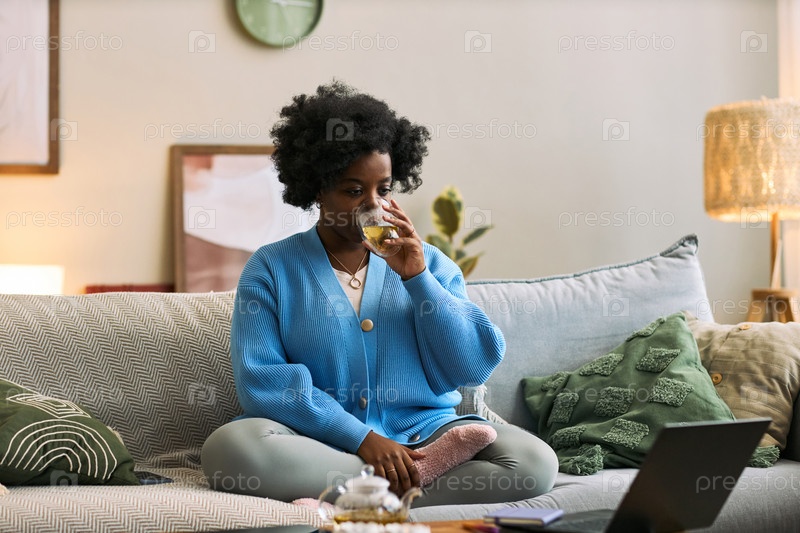 Молодая взрослая чернокожая женщина сидит на диване, пьет чай при использовании ноутбука