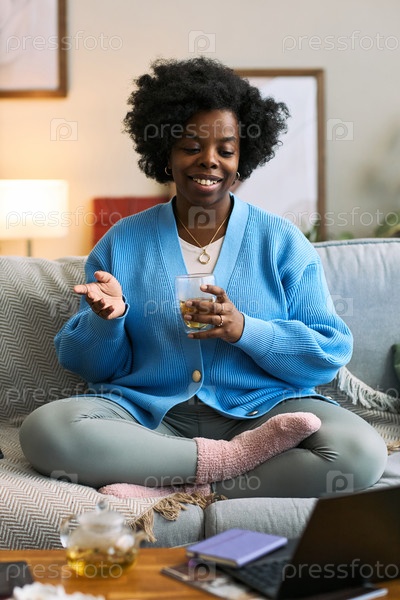 Молодая взрослая чернокожая женщина улыбается, пьет чай во время онлайн-консультации по здоровью