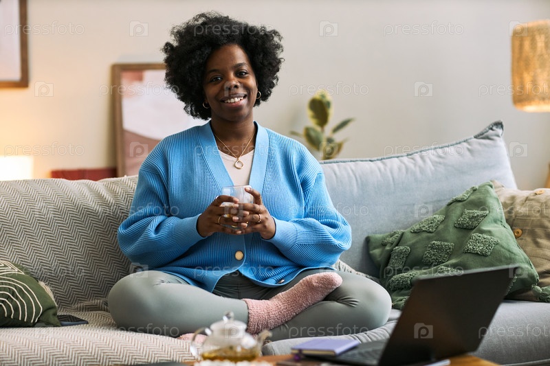Портрет молодой взрослой чернокожей женщины, улыбающейся при использовании ноутбука для здоровья