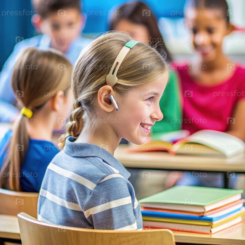 Молодой студент, носящий слуховой аппарат в классной обстановке