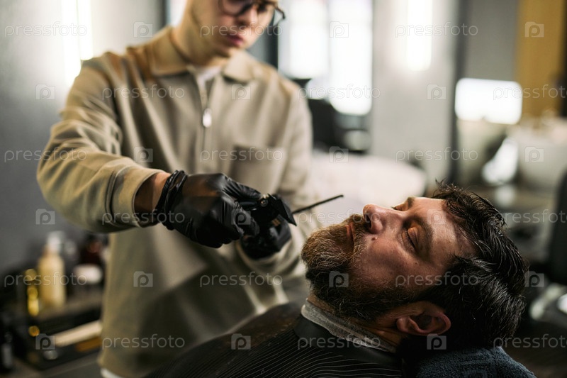 Кавказский мужчина средних лет получает стрижку бороды от молодого парикмахера