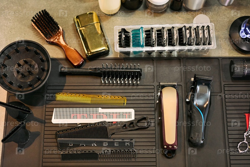 Инструменты парикмахерской расположены на столешнице, демонстрируя профессиональное оборудование для ухода за собой