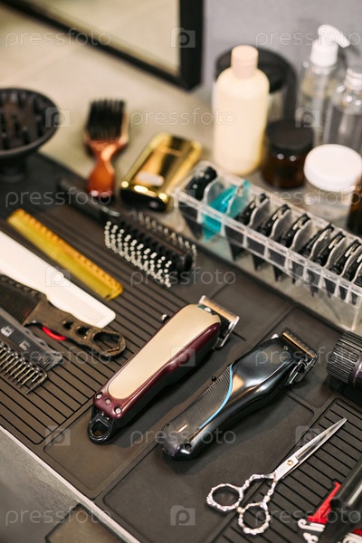 Инструменты парикмахерской, расположенные на столешнице, включая клипперы и ножницы