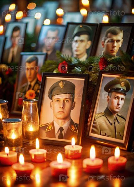Памятные свечи освещают портреты российских солдат