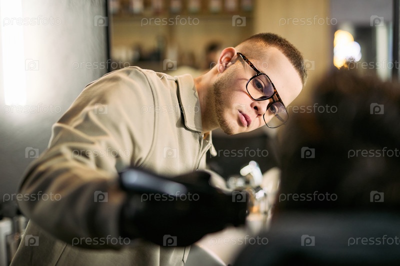 Молодой белый мужчина, носящий очки, обрезает волосы клиента в парикмахерской