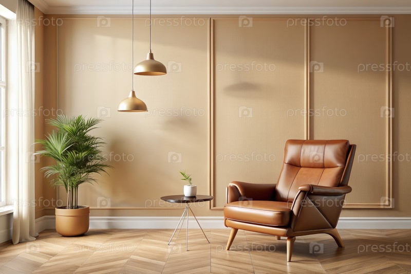 Минималистская гостиная с кожаным креслом и подвесными огнями