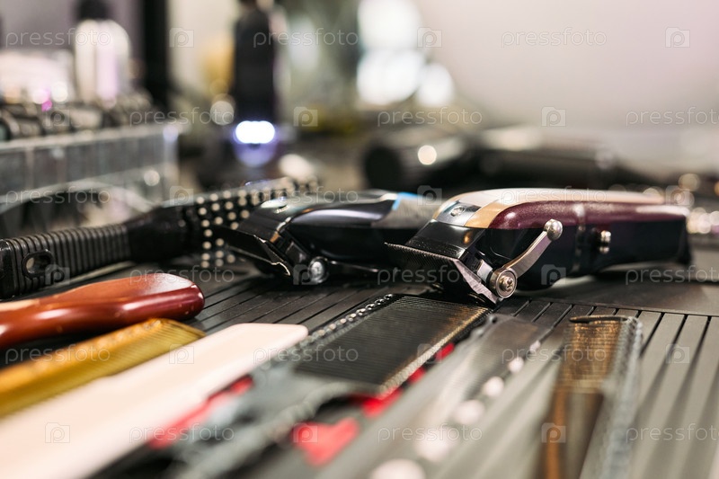 Клюзовое изображение электрических стрижек и греблей, расположенных на стойке парикмахера
