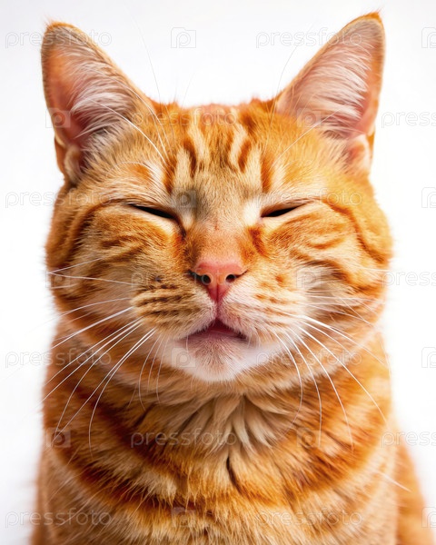 Улыбающаяся имбирная кошка с закрытыми глазами на белом фоне