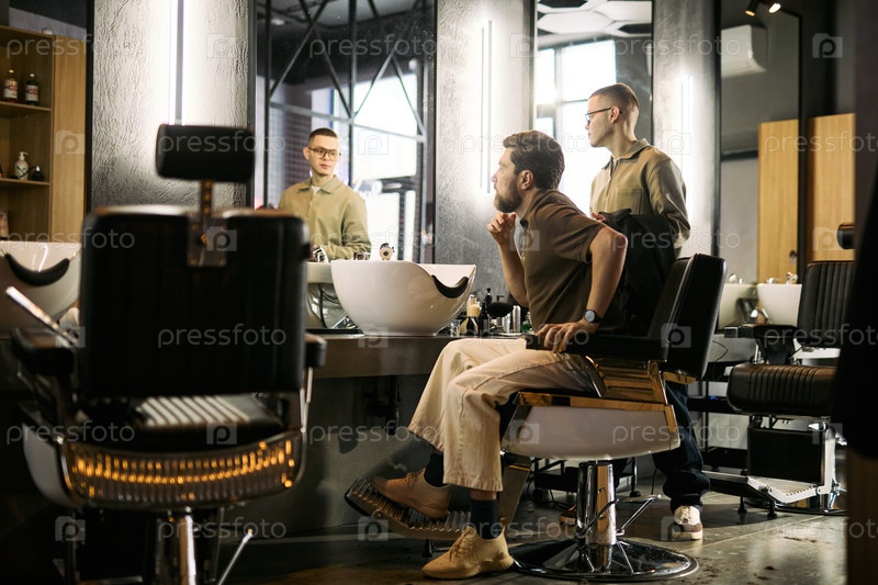 Молодой белый мужчина сидит в парикмахерском кресле, ожидая стрижки