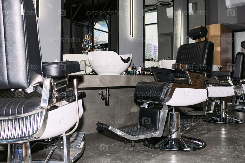 Пустые стулья парикмахерской стоят в современном салоне интерьера днем